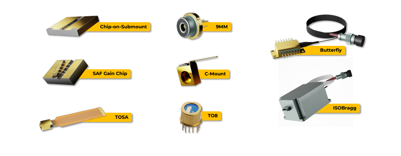 Ces lasers sont disponibles dans plusieurs formats afin de répondre à des contraintes d’intégration variées : chip, boîtiers free-space, boîtiers butterfly, ainsi que modules fibrés avec isolateur optique. Cette diversité de conditionnements permet d’adapter la source au niveau de compacité recherché, à la gestion thermique, au type de couplage optique et à l’architecture instrumentale visée. Certaines versions fibrées proposent en outre une sortie sur fibre à maintien de polarisation avec connectique adaptée aux systèmes photoniques de précision.