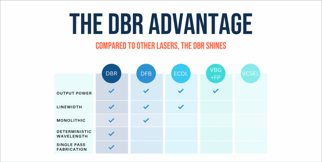 Grâce à une maîtrise complète de la conception et de la production, les lasers DBR Photodigm se distinguent par une excellente qualité de faisceau, une grande stabilité spectrale et des niveaux de puissance parmi les plus élevés actuellement disponibles pour des diodes laser monofréquence individuelles.